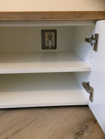 Geen probleem: wij maken een uitsparing in de achterwand. Hierdoor is dit stopcontact gewoon bruikbaar en/of kunnen we vanuit dit stopcontact zorgen voor een stroompunt op een andere plaats in of op je meubel.