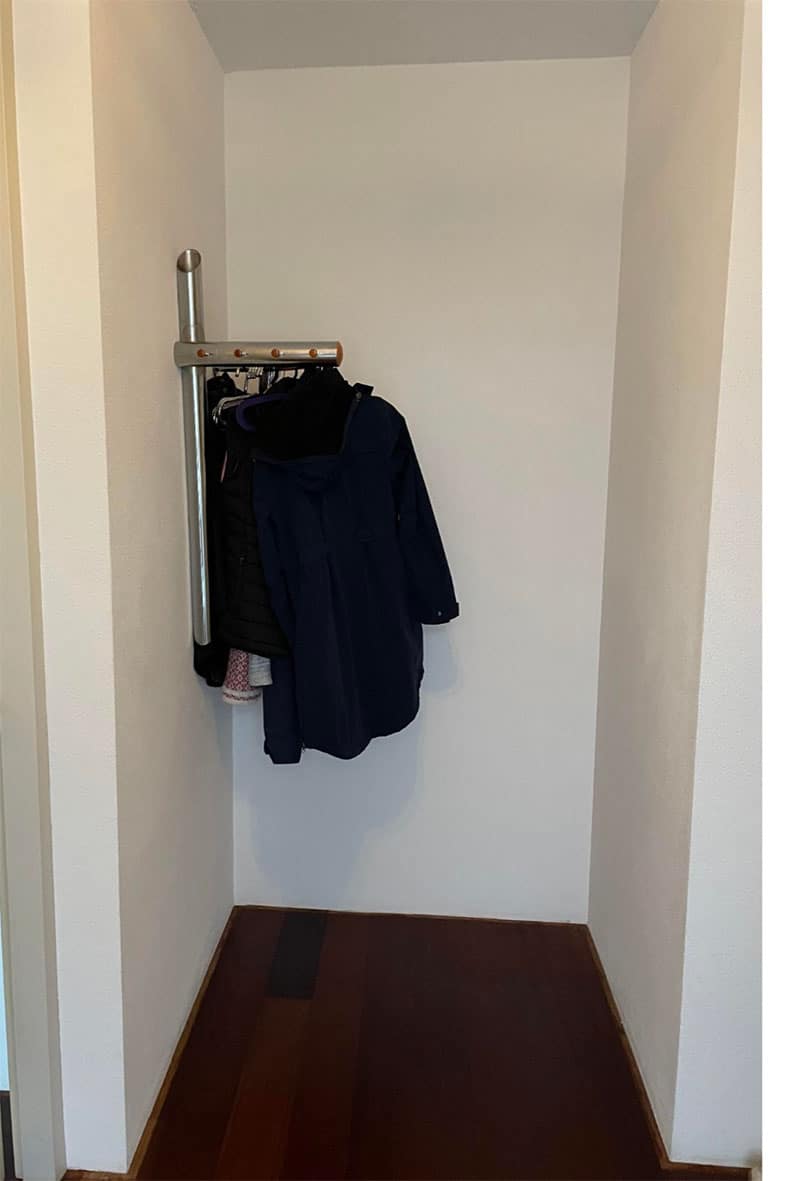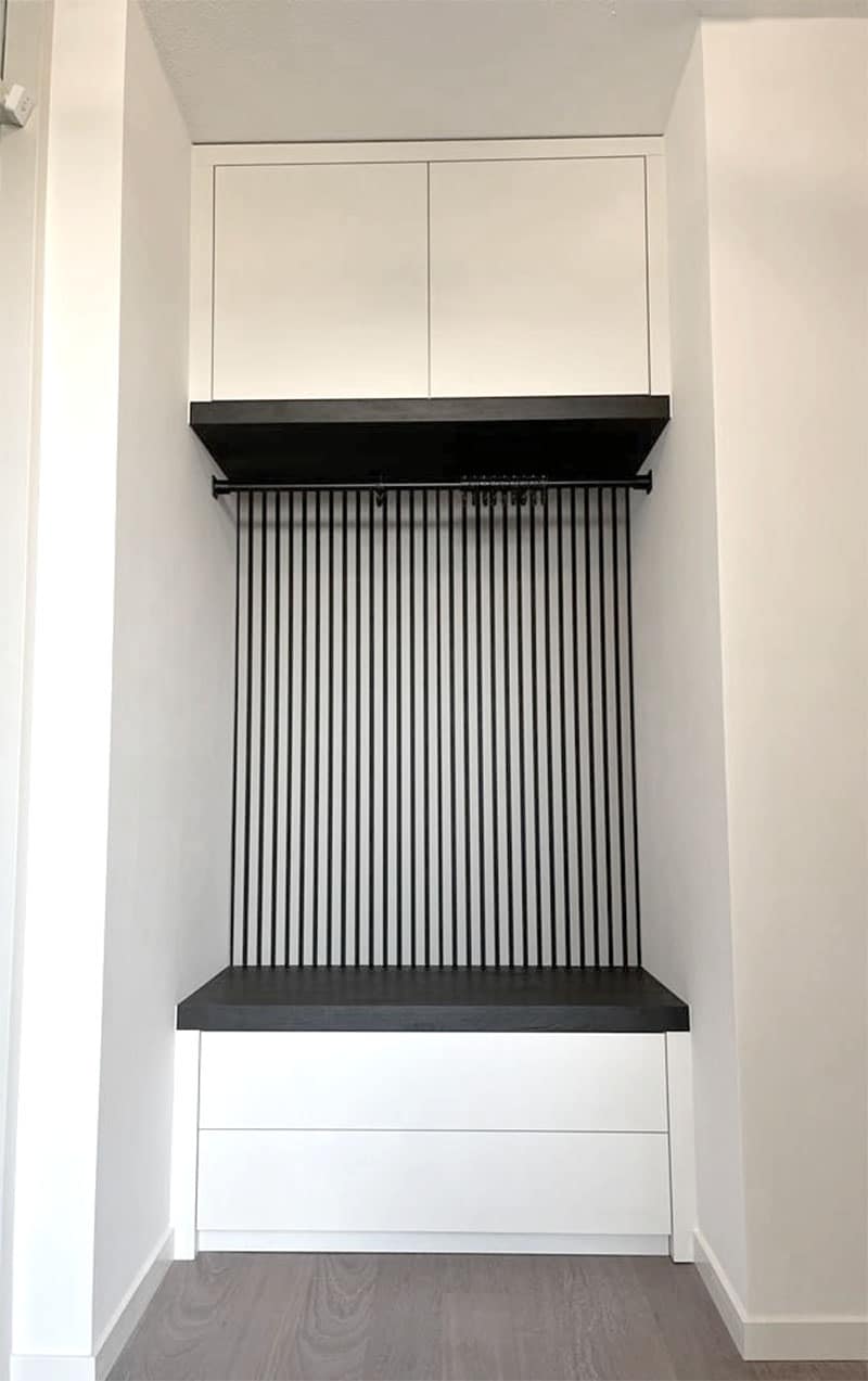 Ik adviseerde haar een kant-en-klare latten wand aan te schaffen bij één van de vele leveranciers via internet. Dit omdat dit gewoon kosten scheelt en in dit ontwerp prima (technisch) kon. Verder adviseerde ik ook om deze latten wand niet over de hele hoogte van de nis, maar alleen in het deel tussen de onder-en bovenkasten van het garderobekast te plaatsen. Hierdoor kan ze deze namelijk ook altijd weer verwijderen, mocht ze bijvoorbeeld deze garderobe nis ooit een andere uitstraling willen geven. Zo kan je garderobekast gemakkelijk aangepast worden aan jouw toekomstige wensen en heb je extra lang plezier van je maatwerk meubel!