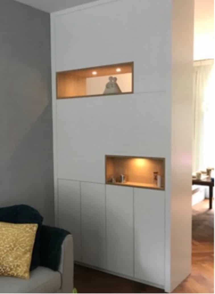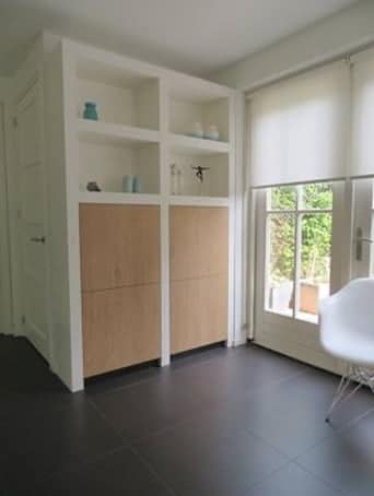 Kasten die aansluiten tot het plafond staan meestal ook met één zijde vast tegen een muur of tussen 2 muren in. Maar een inbouwkast tot het plafond midden in de ruimte is ook heel goed mogelijk. Vaak is het dan de scheiding tussen twee functionele ruimtes, bijvoorbeeld de zit-en eethoek.