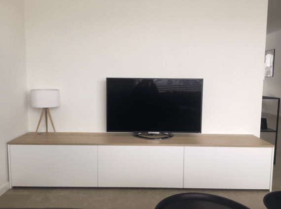 Normaliter is de binnenkant van een kast wit. Als we de binnenkant van de kast in een kleur maken, dan geeft dit een mooiere en chiquere uitstraling. De chiquere uitstraling komt in kleur helemaal tot zijn recht als je kiest voor een kast met een houten uitstraling. De meest voorkomende kleuren die we hiervoor gebruiken zijn lichtgrijs, donkergrijs, taupe en zwart. De meerprijs is op aanvraag, maar voor een gemiddelde tv-kast kost het een paar tientjes extra.
