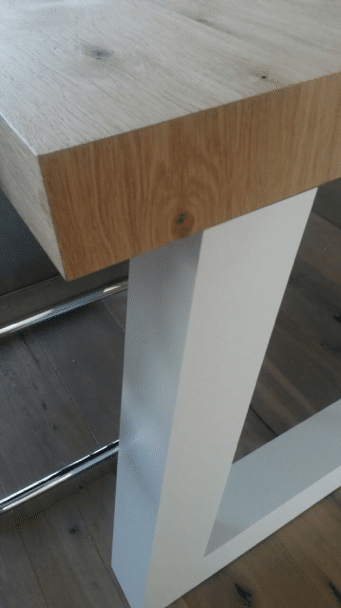 We werken bij het maken van onze meubels soms met (eiken)fineer. Dit materiaal wordt altijd voorzien van een doorzichtige matte beschermlaag om vlekken en vergeling zoveel mogelijk tegen te gaan. Deze beschermlaag kan door onze spuiter maar ook door jezelf aangebracht worden.
