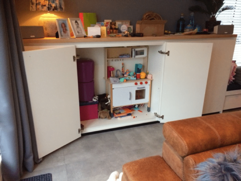 (we hebben de kast zo gemaakt dat het keukentje nu hierin kan staan en eventueel makkelijk eruit gehaald kan worden, maar straks als hier niet meer meegespeeld wordt, deze kastruimte ook weer ‘gewoon’ gebruikt kan worden.)