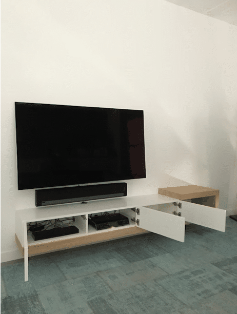 Ook het eindresultaat van de tv-kast is helemaal naar wens geworden en de tv-kast sluit super mooi aan bij de andere meubels die een jaartje eerder geleverd zijn. Het geheel klopt gewoon en geeft deze standaardwoning echt een rijk gevoel en een echt thuis voor dit gezin!