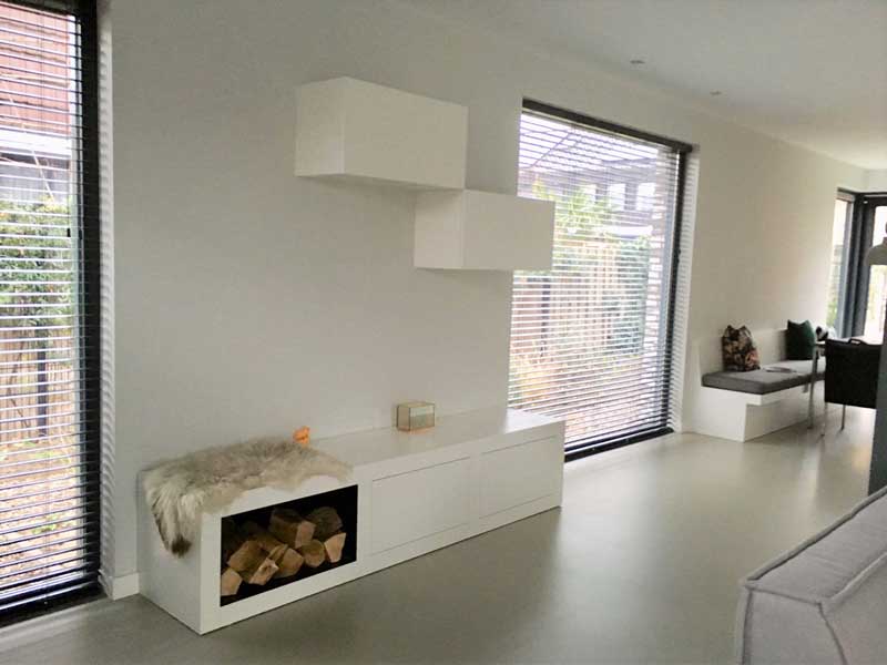 Afgelopen zomer nam Joyce contact op met ons. Haar nieuwbouwhuis werd binnenkort opgeleverd en ze zocht op korte termijn naar diverse maatwerk meubels. De interieurarchitect die de indeling van het huis had verzorgd had onze naam aan haar doorgegeven. Ze had namelijk ons werk gezien bij een ander nieuwbouwhuis en ze was onder de indruk. Een mooi compliment!