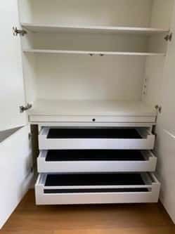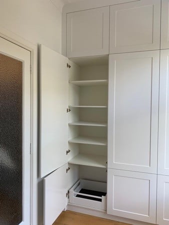 Vandaar mijn voorstel om een smal en een breed kastdeel te maken. Ik heb wel meteen gezegd dat de brede planken kunnen gaan doorhangen als er zware spullen op komen te staan. Maar omdat het smalle deel veel verstelbare legplanken heeft en er ook nog brede lades onderin de kast geplaatst worden, is er genoeg plaats voor de wat zwaardere spullen.
