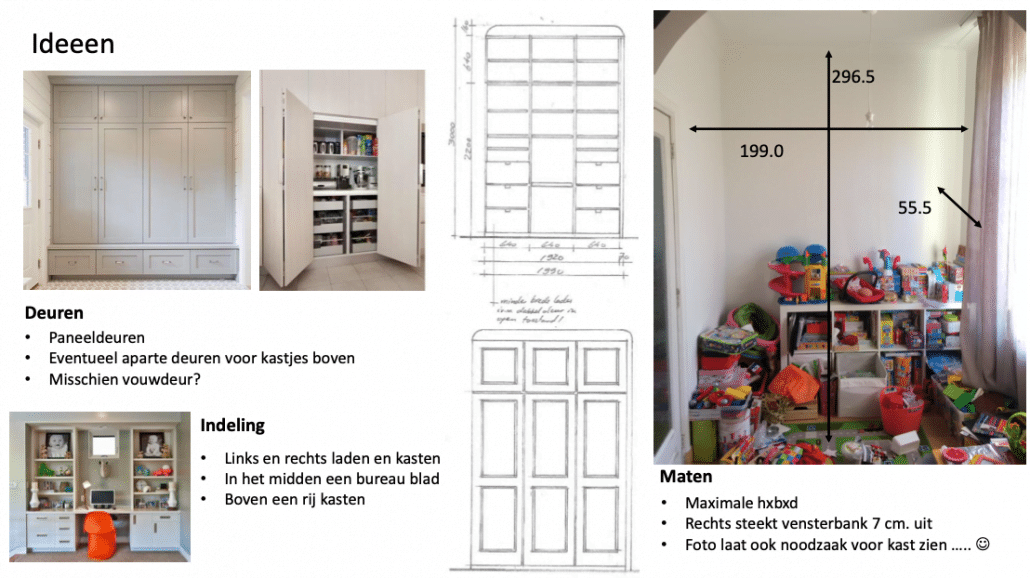 Na 3 jaar een rommelige kinderhoek zouden wij graag een kast op maat laten maken om het speelgoed netjes te laten ‘verdwijnen’. Bij voorkeur is dit een kast op maat die van muur tot muur en van vloer tot plafond aansluit (ongeveer 2×3 meter). Wij hebben een aantal ideeën bijgevoegd. Zou dit iets zijn waar jullie wellicht bij zouden kunnen helpen?