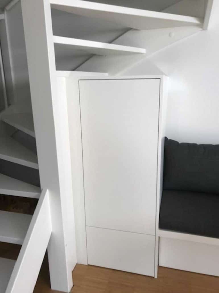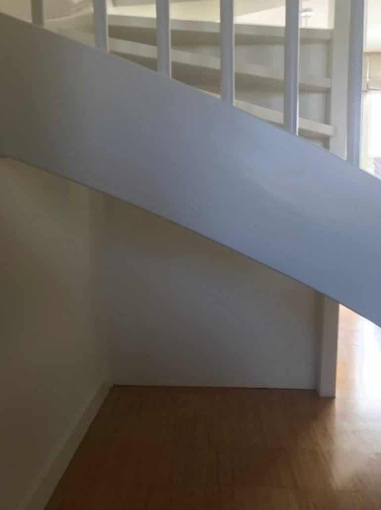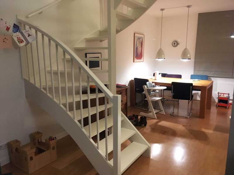 - De hoogte van de kast is exact afgestemd op de hoogte van de traptrede, waardoor de kast één geheel wordt met de trap. Doordat de zijkant en de achterzijde van de kast door ons zijn dichtgemaakt ontstaat een rustige uitstraling en bovendien: geen last meer van stofhoeken!