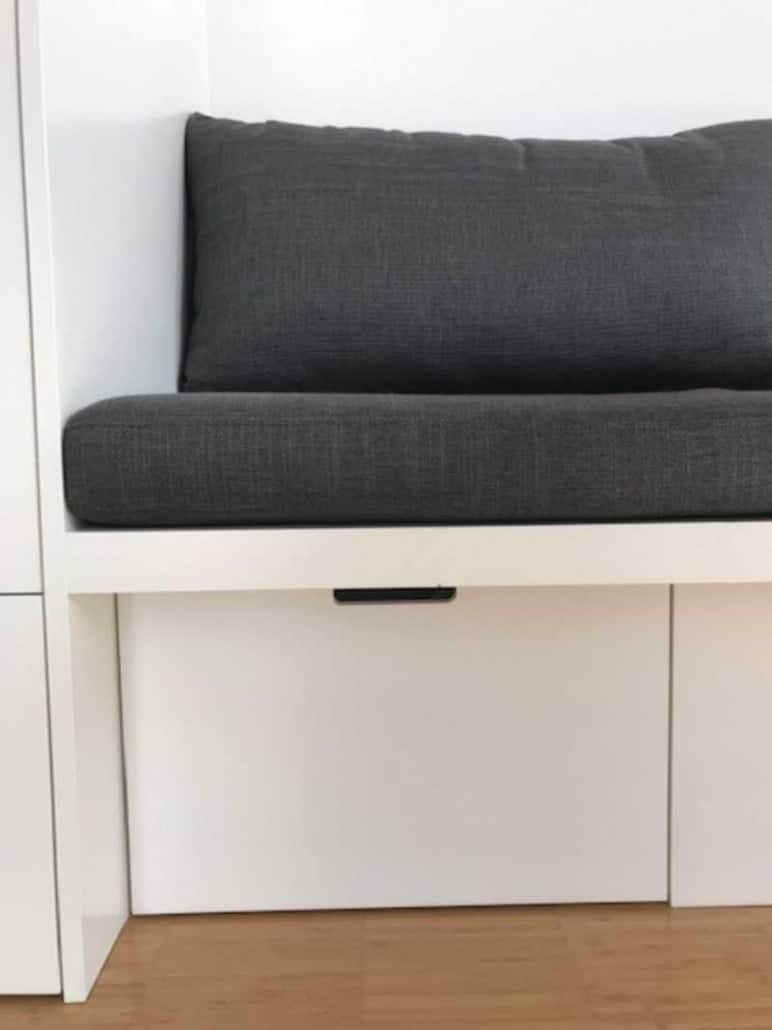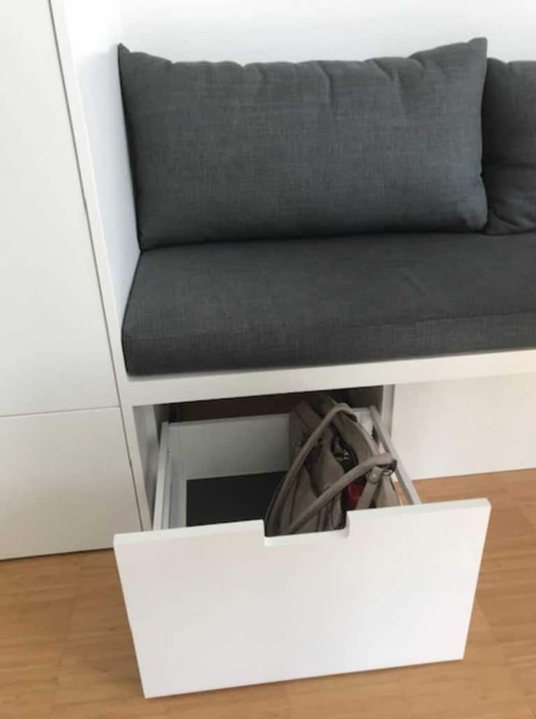 - Rondslingerende werktassen waren altijd een grote ergernis van de bewoners. Door de lade in de bank exact af te stemmen op de maten van de tassen kunnen deze nu iedere avond netjes opgeborgen worden.