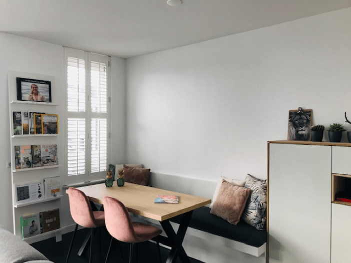 - De wandbank hebben we exact op maat gemaakt, zodat deze nu mooi aansluit tussen de al bestaande kast en de linker zijmuur. De wandbank is tevens onzichtbaar aan de kast gemonteerd, waardoor alles naadloos aan elkaar aansluit.