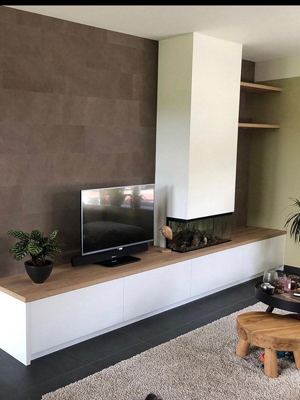 Doordat de klant de achterwand al voorzien had van een warme, bruine tint werd er direct al meer warmte gecreëerd. Wij hebben de warmte letterlijk in huis gehaald door een sfeervolle haard te integreren in het nieuwe tv-meubel. Daarnaast hebben we het tv-meubel naadloos doorgetrokken tot aan de wand waarbij we de ruimte tussen de wand en de haard hebben benut door slimme wandplankjes toe te voegen. Deze plankjes zijn niet alleen praktisch, maar hebben ook subtiel geïntegreerde spotjes om de items op de planken prachtig te belichten. De bovenste plank van het tv-meubel is bedekt met houtlook, wat een natuurlijke en warme uitstraling geeft aan het geheel.