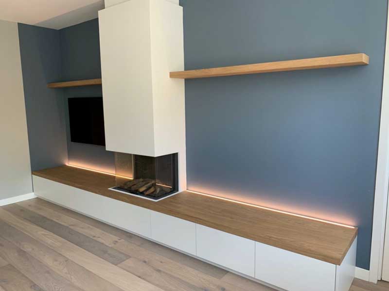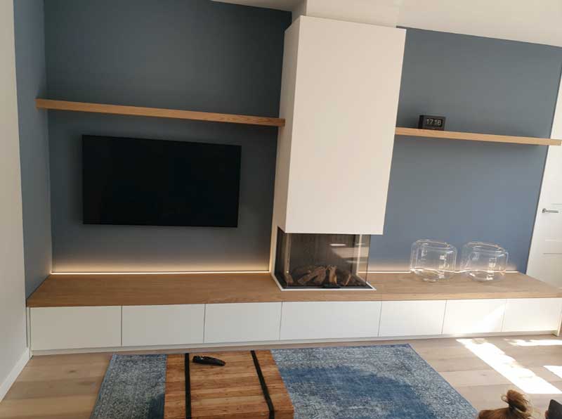 Voor dit soort aanvragen zijn de afmetingen van de bestaande schouw en de muur bepalend voor de maten van het project. Bij maatwerk meubels zit je nooit vast aan vaste maten en kunnen we elk meubel in de gewenste maat maken.