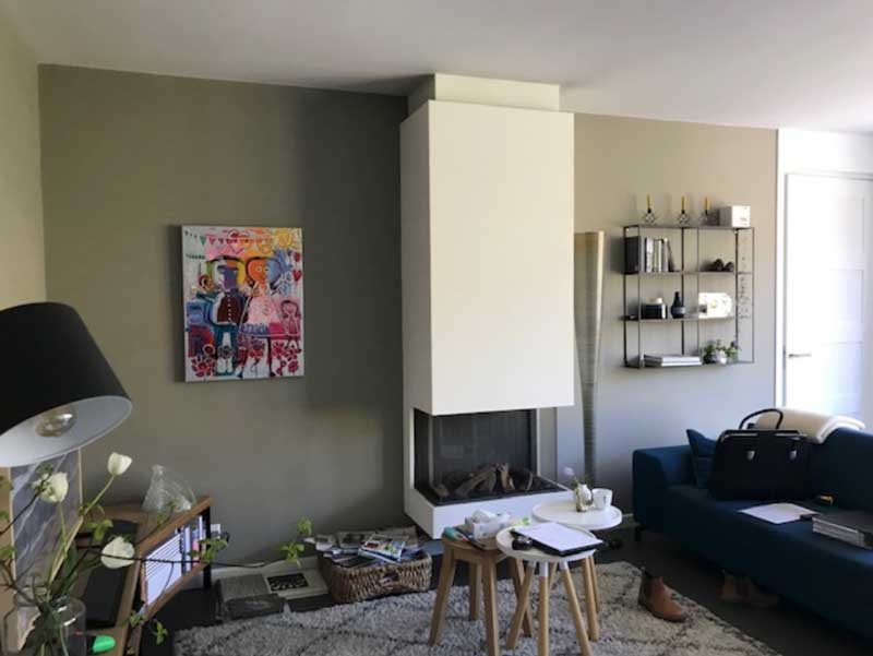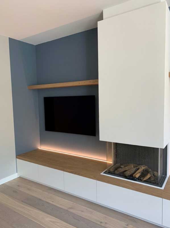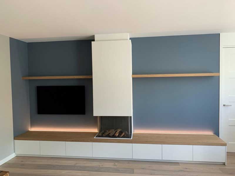 Deze woning had al een bestaande haard in het midden van de muur. Ze wilden deze ruimte zo optimaal mogelijk benutten met opbergruimte. We hebben bedacht om links en rechts van de haard lage kasten te plaatsen met daarboven zwevende planken.