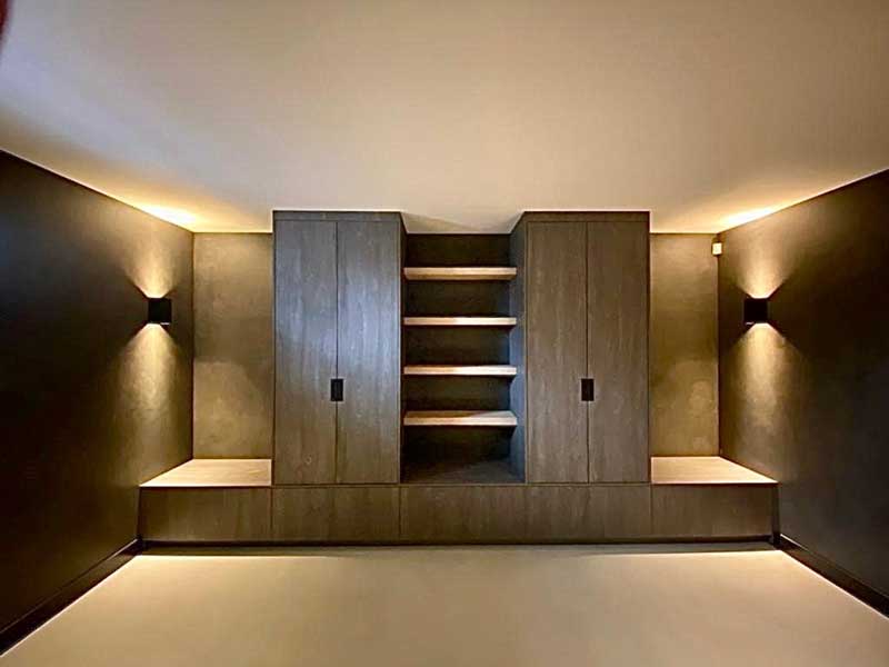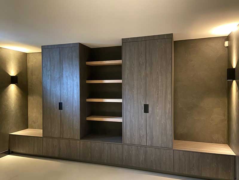 Een jaar geleden hebben wij op verzoek een 5 meter breed TV-meubel op maat gemaakt en geplaatst. Onlangs heeft de ruimte een andere functie gekregen, waardoor het TV-meubel onnodig werd. We dachten met de bewoners mee en kwamen tot een goede oplossing. We hebben van dit grote TV-meubel een functionele (kleding)kastenwand kunnen maken.