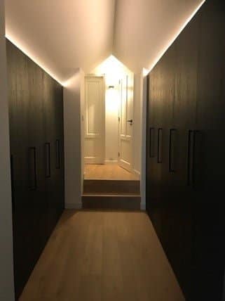 - Deze doorloopruimte heeft geen lichtpunt in het plafond en geen ramen. Door ledstrips aan de bovenzijde van de kast te plaatsen ontstaat een chique geheel én is er toch altijd voldoende licht in deze ruimte. Door de binnenkant van de kast lichtgrijs te maken én in ieder kastdeel een ledstrip in te frezen heb je ook voldoende licht in de kast.