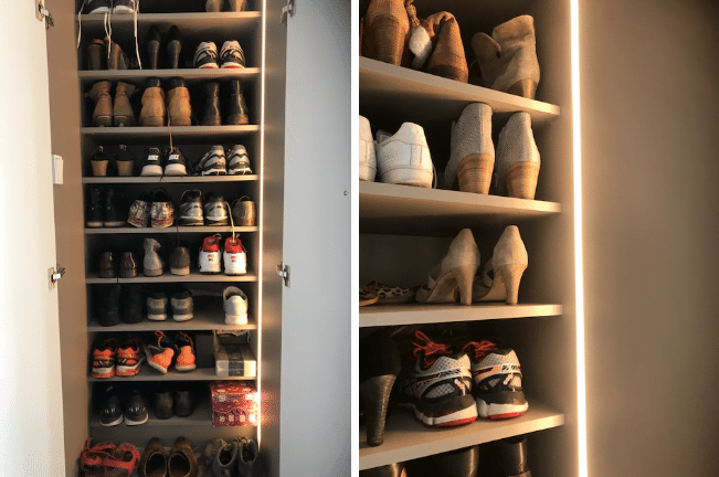 - De ingefreesde ledstrip zorgt ervoor dat je op iedere plank goed licht hebt en geeft een luxere uitstraling dan bijvoorbeeld een plafondspot die op de schoenen gericht wordt.