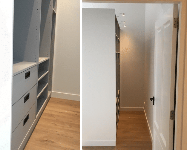 - Dochterlief wilde heel graag een inloopkast. Door de kast dwars tegen de muur te plaatsen ontstaat dit op een simpele manier. De verlichting op de kast (en de nog te plaatsen spiegel op de muur) maken het helemaal af.