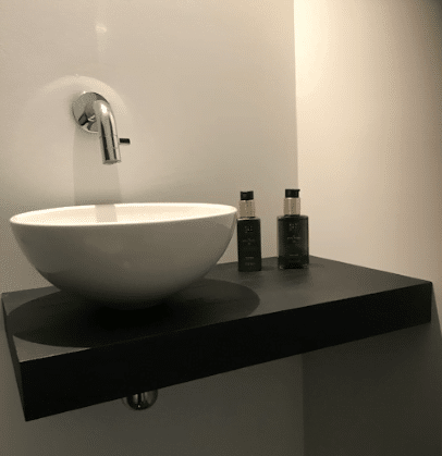 - In beiden toiletruimtes hebben we een maatwerk plank geleverd voor de waskommen. Doordat de exacte maat van de afvoer en de chiffon door ons uitgespaard zijn is het eindresultaat strak en stoer. Je ziet het: het hoeft niet altijd ingewikkeld te zijn.