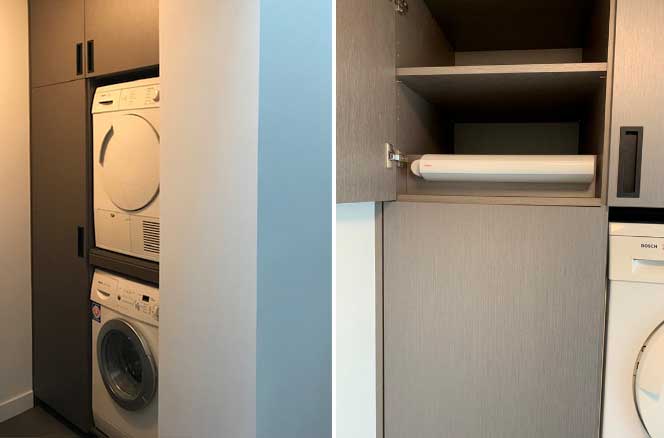 - Leifheit droogrek naar voren geplaatst in het bovenste kastdeel. Hierdoor kun je er makkelijker bij en is het rek netjes weggewerkt als je deze niet gebruikt. Een simpele en praktische oplossing als je toch ook een drooglijn wilt hebben maar deze niet in het zicht wilt hebben.