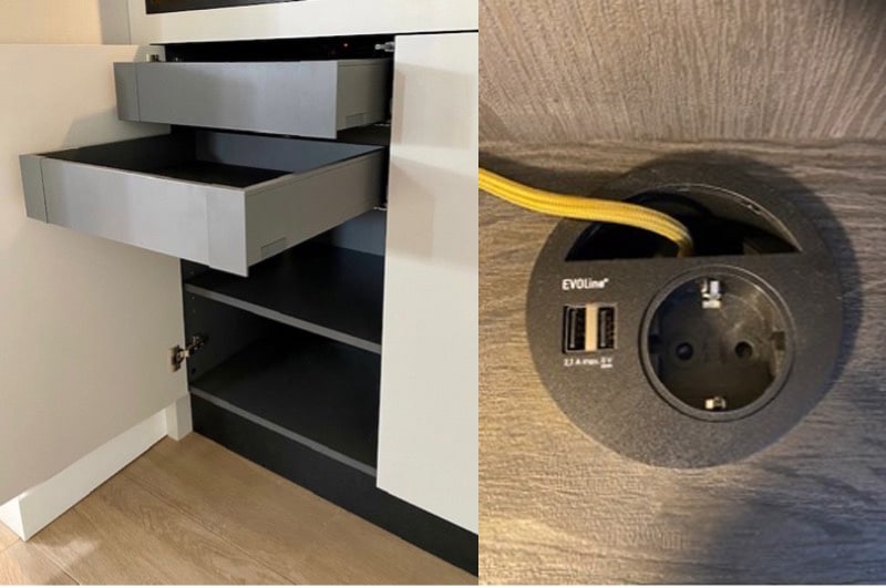 - Alle stopcontacten weggewerkt in de kast waardoor er geen kabels meer te zien zijn.