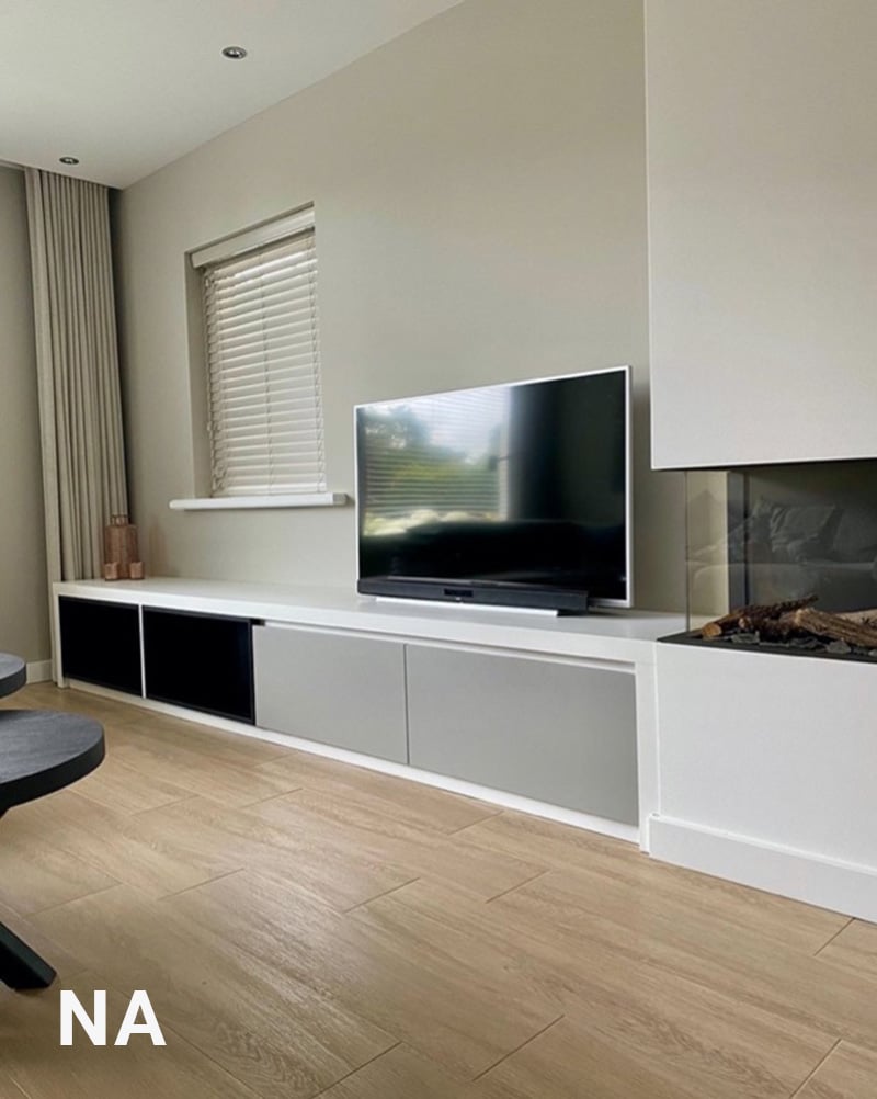 Maaike houdt van accessoires, fotolijstjes en andere gezellige dingen. Haar partner vindt dat nu juist helemaal niks. Hij vindt techniek veel belangrijker: verlichting, draden weggewerkt, genoeg stroompunten etc. Laten wij in onze maatwerk meubels nu mooi aan al deze wensen kunnen voldoen!