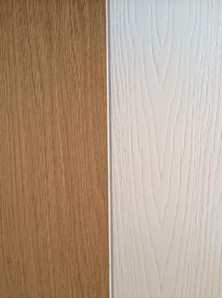 Ik had meteen een oplossing voor haar: het eiken fineer wit laten spuiten door de spuiter waar we altijd mee samenwerken en voila: een witte kast waarbij de houtstructuur toch mooi zichtbaar is.