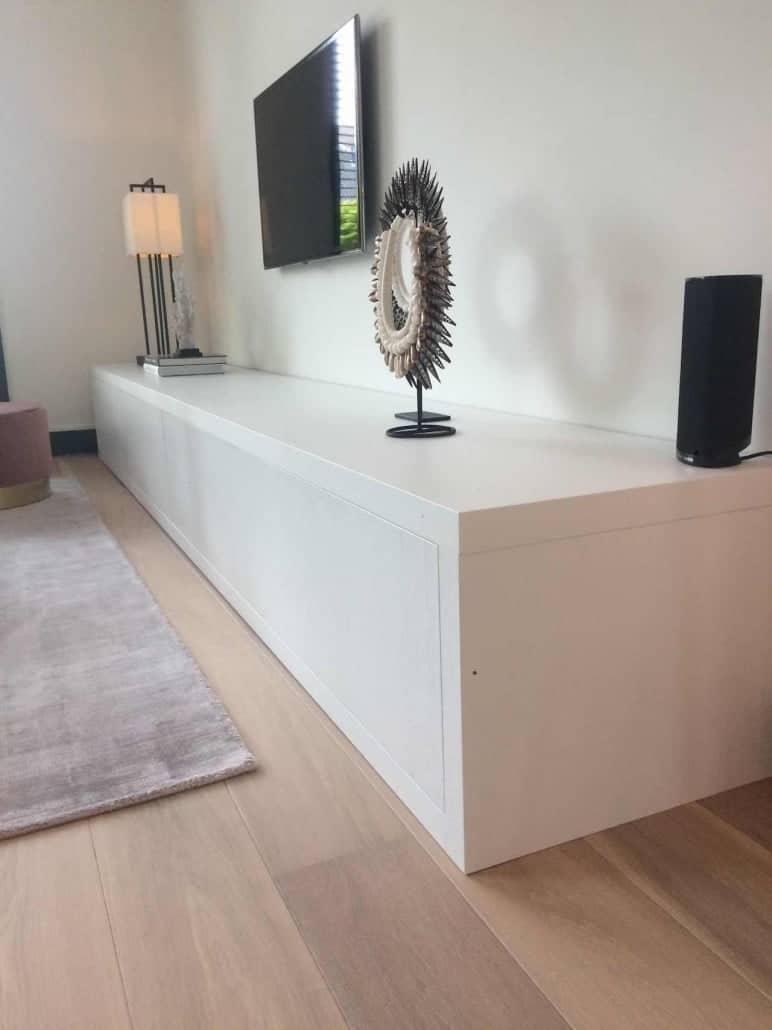 Ze had al diverse tv-meubels op onze website gezien, maar die waren allemaal net niet wat ze voor ogen had. Tijdens haar bezoek aan onze werkhal viel haar oog meteen op de geborstelde eiken fineerstalen die daar uitgestald staan. De mooie houtstructuur van dit materiaal sprak haar meteen aan, maar ja… ze wilde eigenlijk een witte kast en geen houtkleur, dit omdat haar woning een houten vloer heeft.