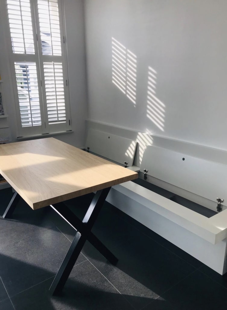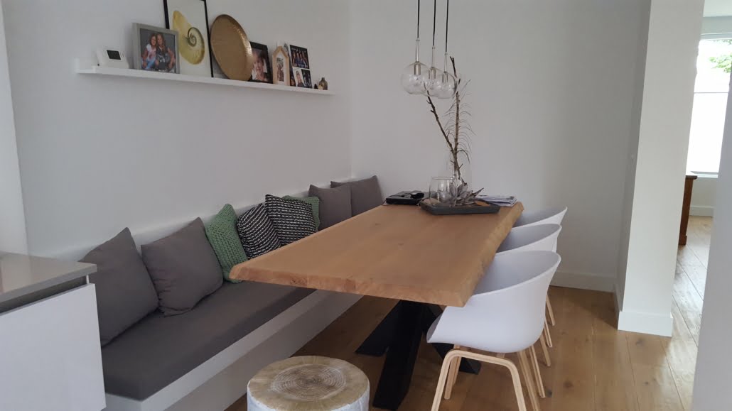 Door het plaatsen van een grote wandbank benadruk je de lengte van de kamer of keuken. Dit zorgt voor een ruimtelijk effect, waardoor de ruimte groter lijkt. Mijn advies is altijd om de bank langer te maken dan je tafel. Hierdoor wordt het ruimtelijk effect nog eens extra benadrukt.