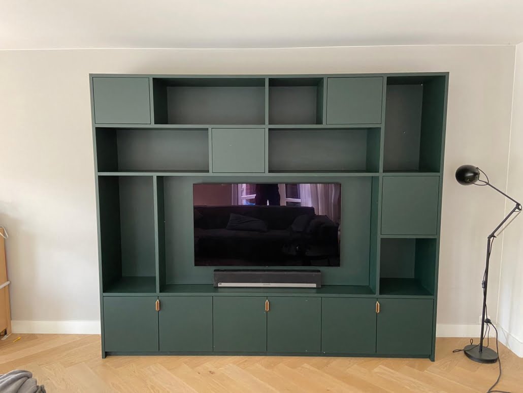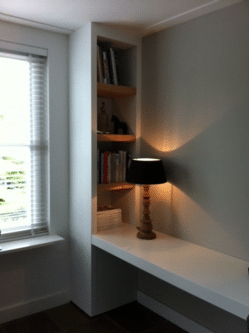 Als de ruimte waar je maatwerk meubel moet komen te staan niet recht is en/of het meubel ter plaatse op maat gemaakt moet worden, je niet met muurverf wilt werken of spuitwerk niet mogelijk is of te duur is dan kan worden gekozen om het meubel af te (laten)lakken. Afhankelijk van je situatie en/of wensen kun je dit zelf doen, kunnen wij dit doen of kan een schilder dit op zich nemen.