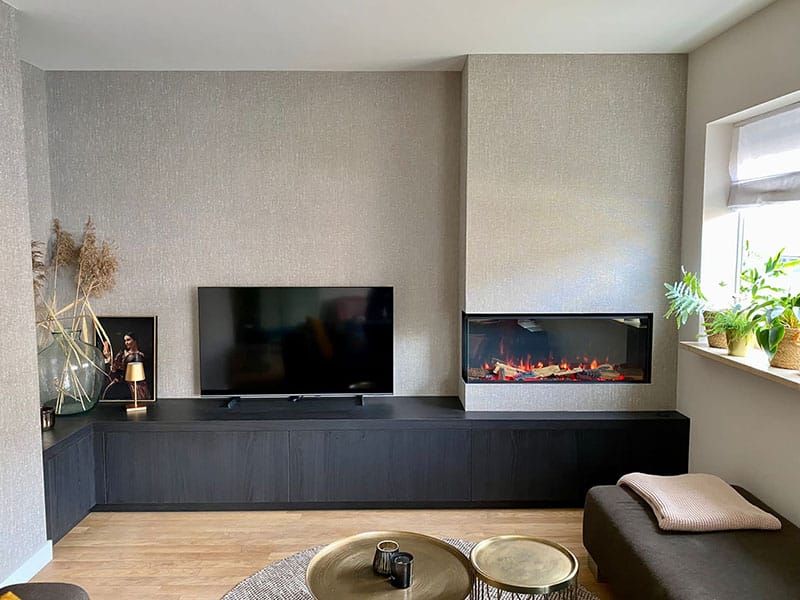We maken niet voor niets maatwerk en dus dachten we mee in een oplossing. We monteerden dit TV meubel met geïntegreerde haard, voorzien van professionele ophangsysteem aan de muur. Voor extra stabiliteit plaatsten we ook een terugvallende hoge plint onder de kast. Deze werd afgewerkt met dezelfde verf als de verf op de muur.